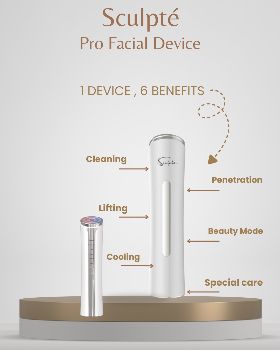 Elevate your skincare routine from home with Sculpté Pro Facial. This 6-in-1 advanced facial device helps smooth fine lines, firm the skin and enhance radiance using proffesional-grade technology- reavealing a visibley refreshed and glowing complexion you will feel confident in every day.